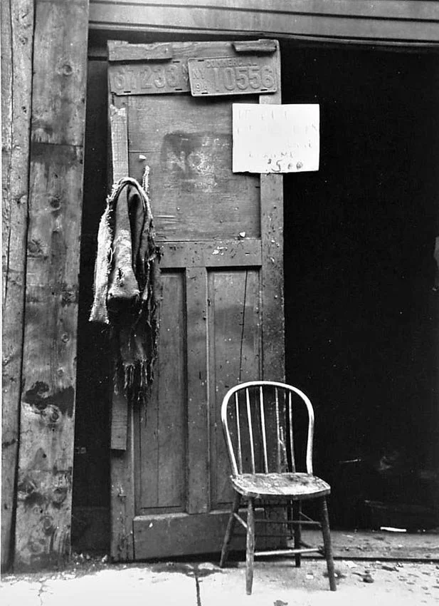 To make a print with overall dark tones and yet hold the detail in the important areas is difficult but rewarding. Below the dark shadows of an elevated train, I photographed an empty chair. Behind it was half of a dark, tall wooden door leaning slightly to the left. Hanging two thirds up on the door was a tattered waistcoat, obviously owned by the man who sat in the chair. Above the jacket, tacked to the right of the door, was a hand-lettered white sign, which read, “if you believe in credit, please loan me $5.00.”