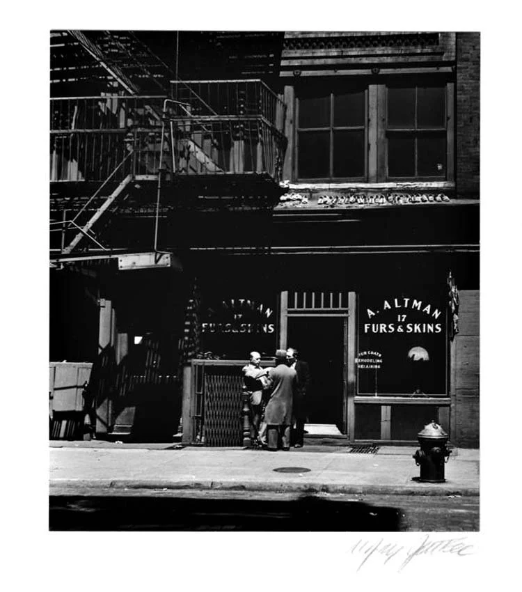 I was in lower Manhattan (now called Soho) one early Saturday morning. Across the street I noticed three men talking with one another in front of a furrier’s shop. The bright morning sun highlighted the men, the sidewalk, a hydrant, the store window, and a row of some two dozen slippers, which were hand-painted and put out to dry on a ledge a floor above the store. The rest of the scene, including the iron fire escape above the men, was in deep shadow. The lighting was so vibrant, it was as though the subjects were stage lit for a Broadway production. I kept the dark shadow in the foreground just before the bright sidewalk so that the light is layered, moving the eye from the bottom of the print to the men, and then to the painted slippers. The dark foreground also gives the print dimension and depth. One wonders what the men were talking about. The warm, peaceful-like setting is offset by the dark ominous mass of iron bars of the fire escapes above the men’s heads.
